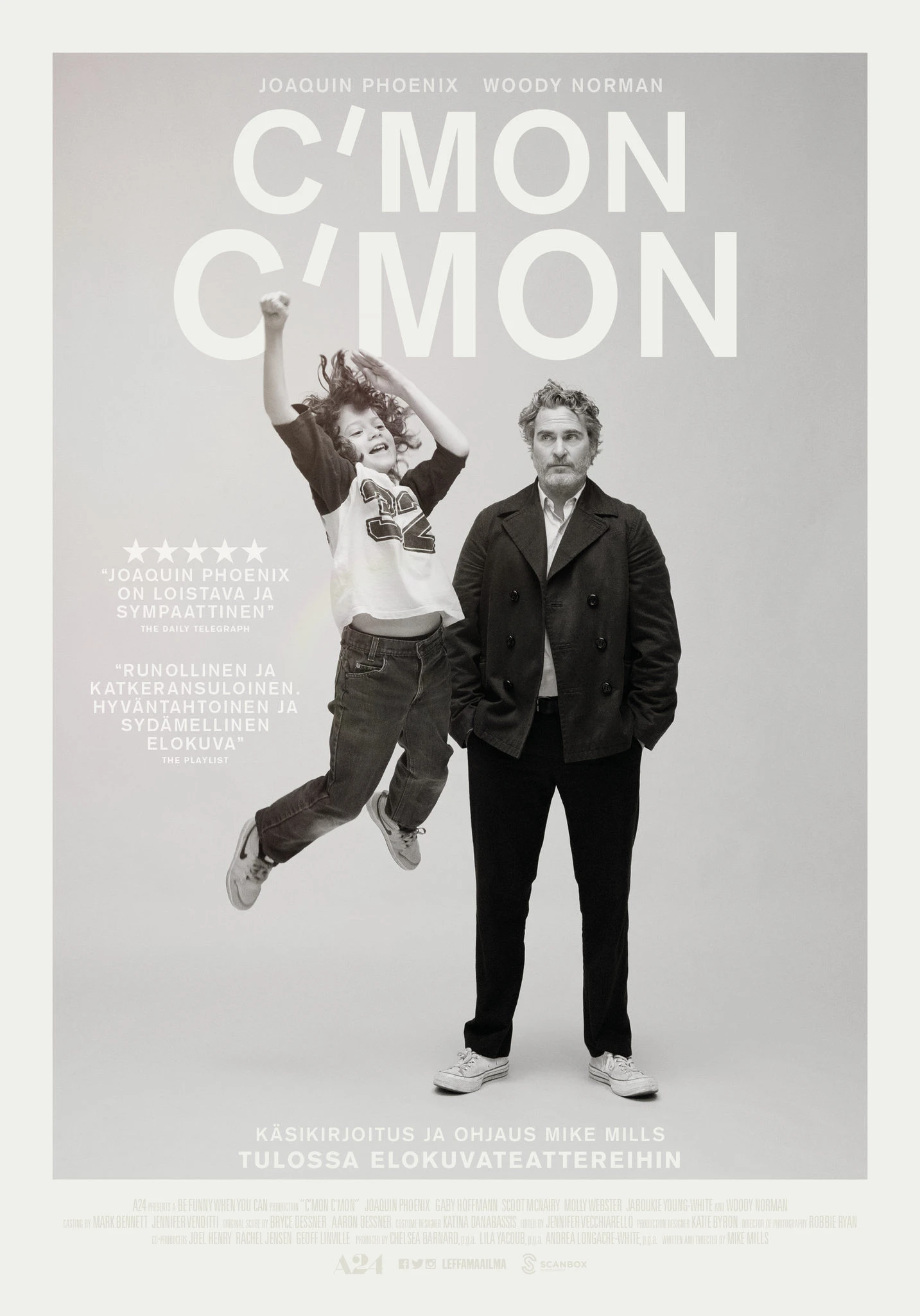 Kun Johnnyn on lähdettävä työmatkalle viimeistelemään radio-ohjelmaansa mutta Jessen äidin matka venyy, poika lähtee hänen mukaansa. Yhteisen taipaleen aikana Johnny joutuu kohtaamaan sellaisia asioita vastuusta, rakkaudesta ja kenties eniten itsestään, mitä on pitkään työntänyt syrjään. Mike Millsin (mm. Vuosisadan naiset, Beginners ja Thumbsucker) käsikirjoittama ja ohjaama C’mon C’mon on lämmin ja koskettava tarina lasten ja aikuisten suhteesta. Elokuva on viime vuosien kiinnostavimpiin kuuluvan indie-studion A24:n (mm. Moonlight, Lady Bird) tuotantoa.
