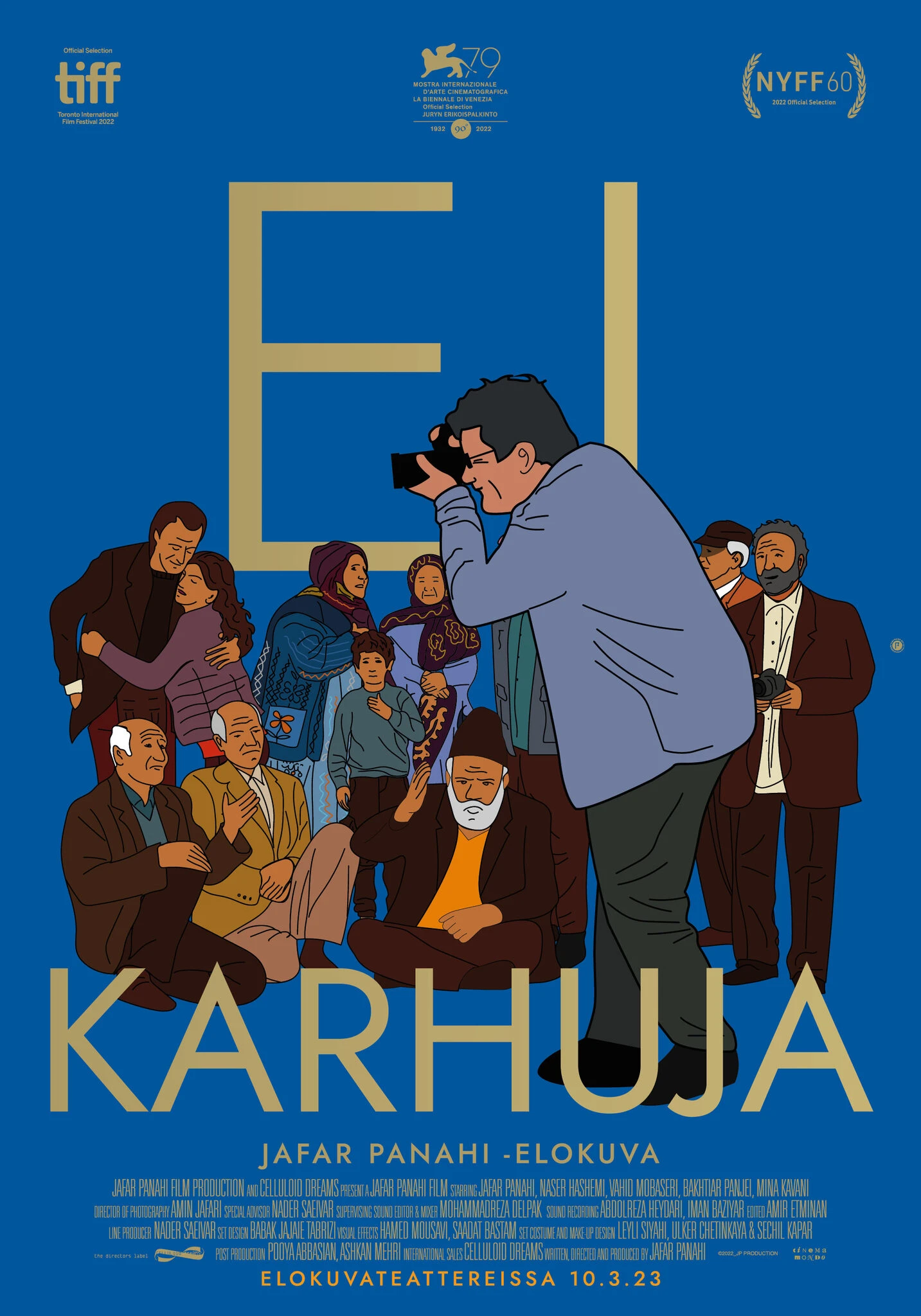 EI KARHUJA on hänen viimeisin elokuvansa. Kuvausten jälkeen Panahi pidätettiin ja tuomittiin epämääräisin perustein vankilaan. Elokuva palkittiin Venetsian elokuvajuhlilla Juryn erikoispalkinnolla.