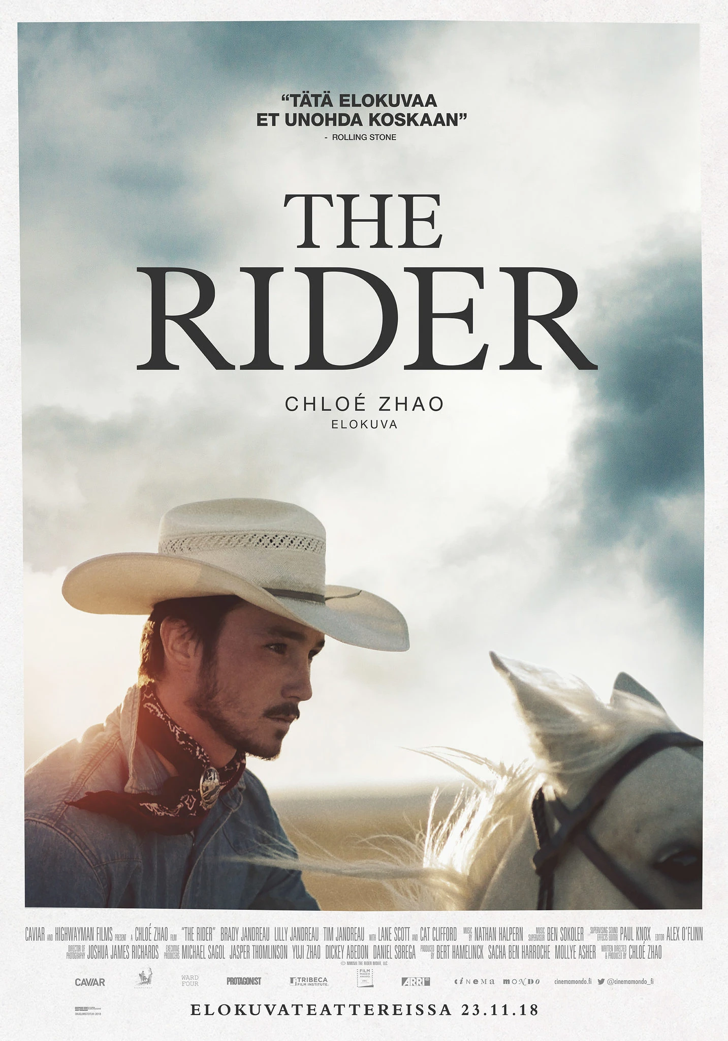 THE RIDER on ohjaaja Chloé Zhaon vahva läpimurto ja yksi vuoden kehutuimpia elokuvia. Elokuva on palkittu mm. Cannesin ja Deauvillen elokuvajuhlilla. Zhao näyttää Bradyn perheen, elämänpiirin ja elämäntavan poikkeuksellisen uskottavasti. Luonnon, ajan ja paikan tuntu imaisee mukaansa. Bradyn ja kumppaneiden elämä käy kirjaimellisesti luihin ja ytimiin.